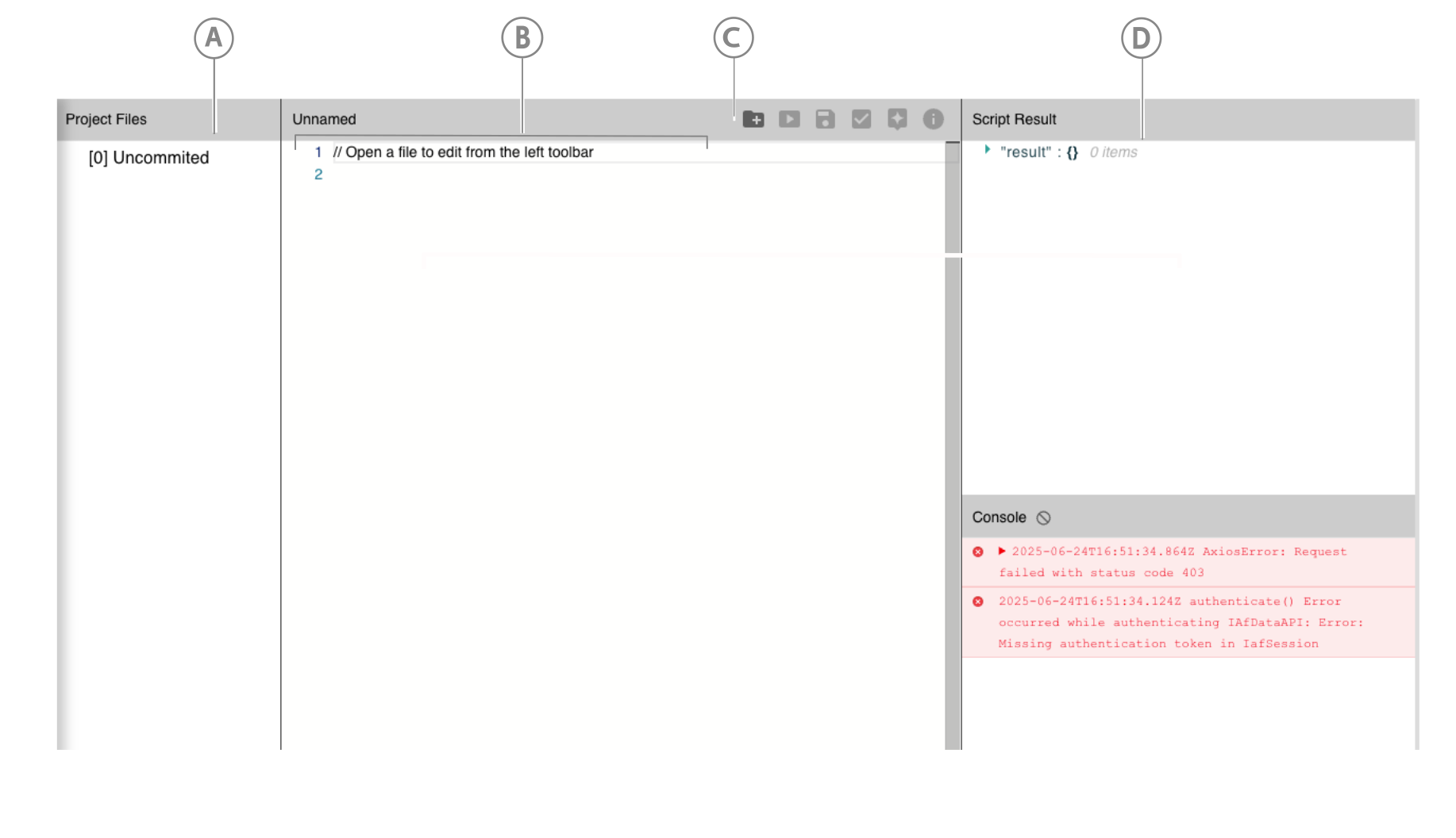 | C | Top menu icons | The top menu lists a series of icons for actions such as Add New File and Execute Script. See Top menu actions below for more details. |