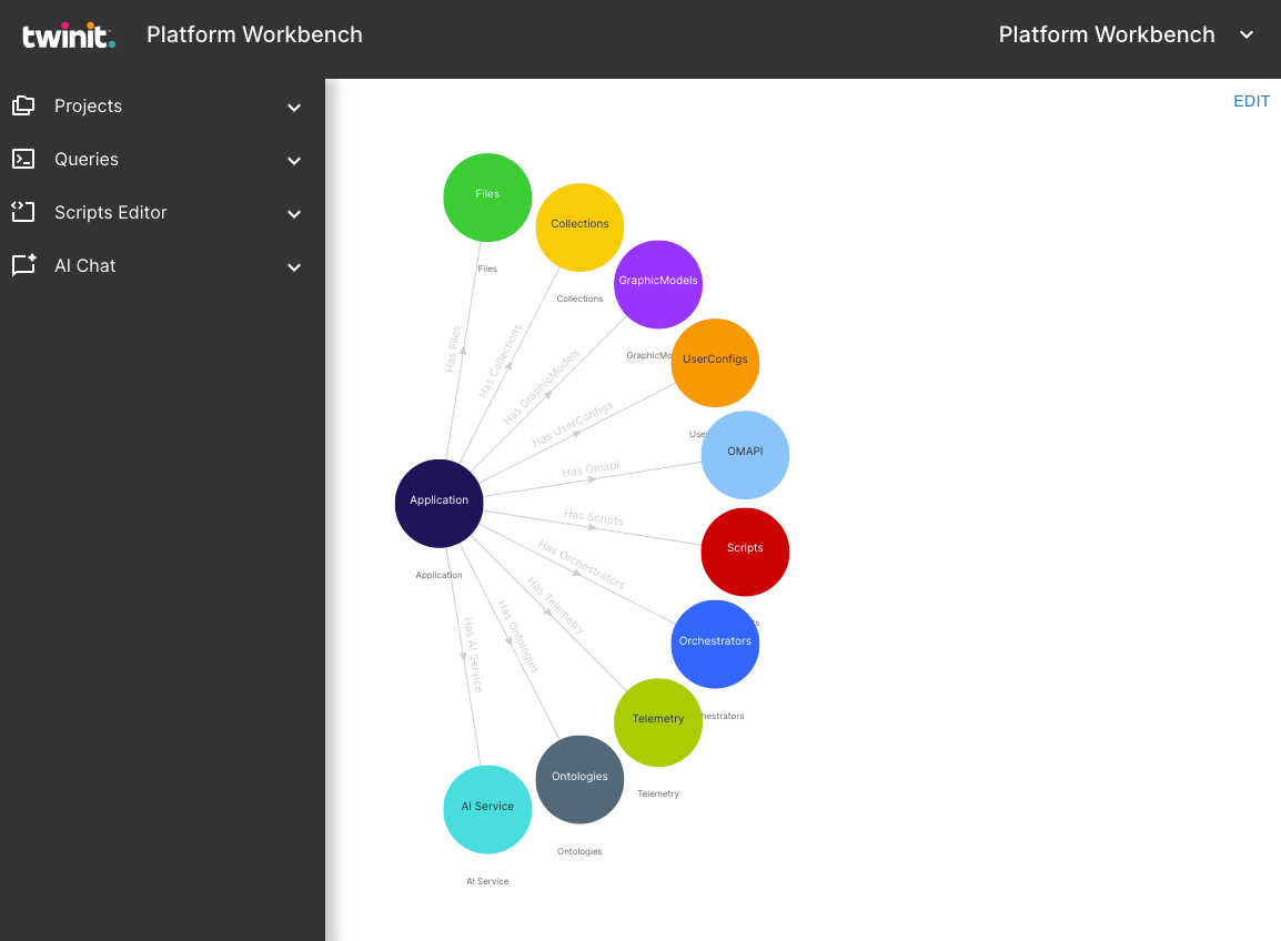 The primary Workbench interface is structured around a knowledge graph model that shows the Platform components as nodes in the knowledge graph. This is referred to as the project or application model.